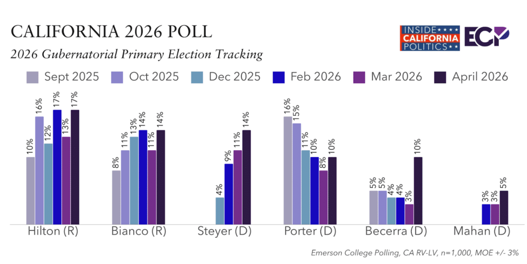 A new Emerson College Polling/Inside California Politics survey of the June 2026 primary for Governor finds 17% support Republican Steve Hilton, 14% Republican Chad Bianco, 14% Tom Steyer, 10% Democrat Xavier Becerra, 10% Democrat Katie Porter, 5% Democrat Matt Mahan, and 23% are undecided.