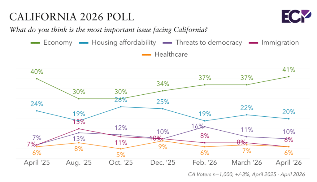 The economy is the top issue for California voters at 41%, followed by housing affordability at 20%, threats to democracy at 10%, crime at 6%, immigration at 6%, and healthcare at 6%.