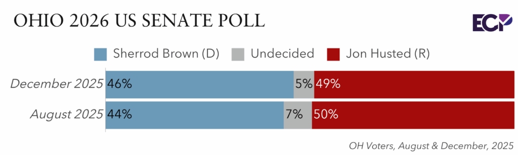 A new Emerson College Polling survey of Ohio voters finds both statewide elections for Governor and U.S. Senate tightening, with both races falling within the poll’s margin of error. In the open seat for Governor, 46% support Democrat Amy Acton, while 45% support Republican Vivek Ramaswamy; 9% are undecided. In comparison to the August 2025 Emerson College poll of Ohio, Ramaswamy’s support decreased four percentage points, from 49% to 45%, while Acton’s support increased seven points, from 39% to 46%.